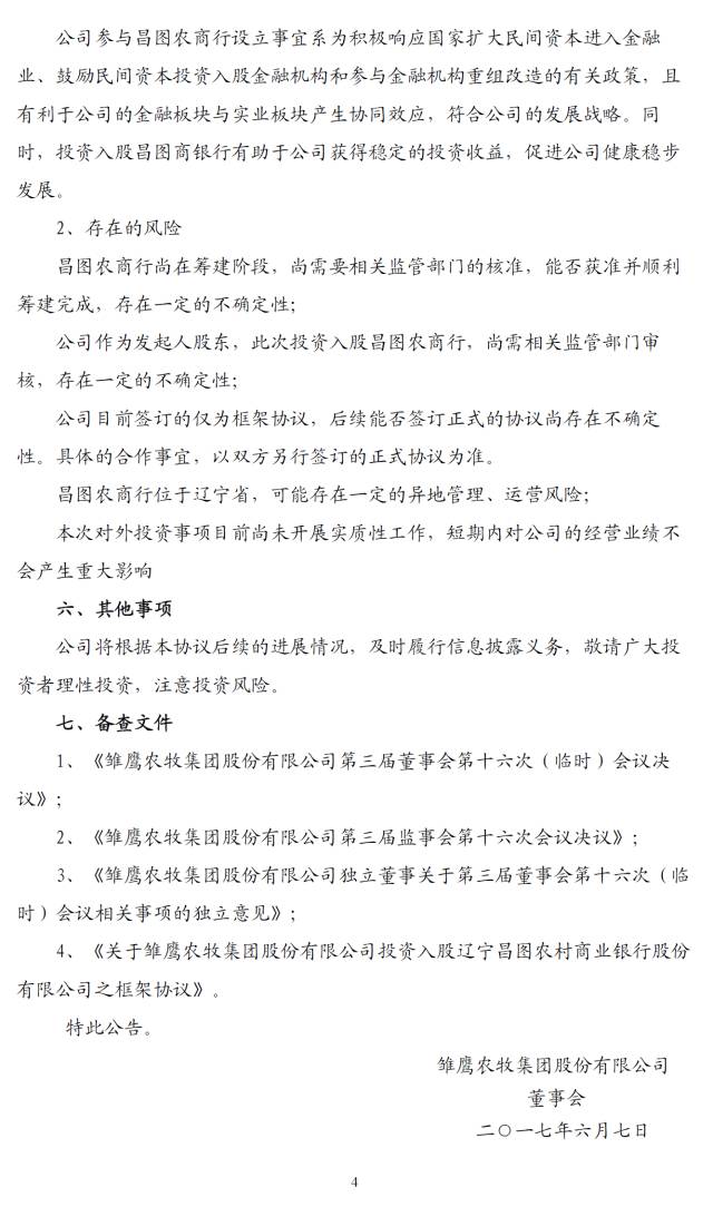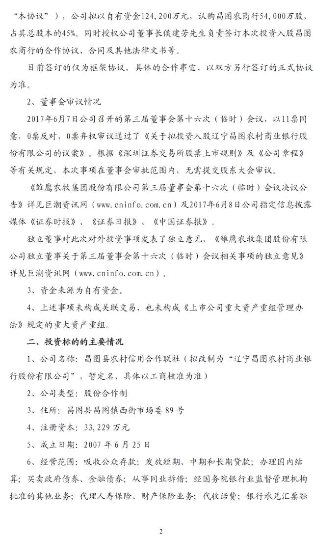 今日晚公告顯示,近日公司與昌圖農(nóng)商行籌建工作小組簽訂了《關(guān)于雛鷹農(nóng)牧集團股份有限公司投資入股遼寧昌圖農(nóng)村商業(yè)銀行股份有限公司之框架協(xié)議》,公司擬以自有資金124200萬元,認購昌圖農(nóng)商行54000萬股。
