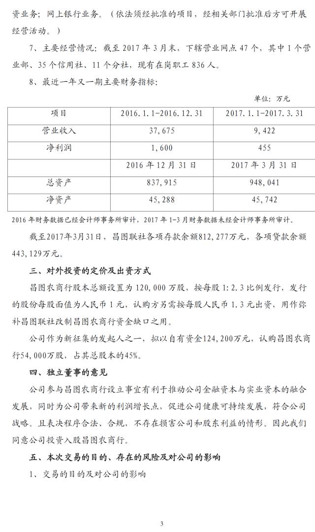 公司參與昌圖農(nóng)商行設(shè)立事宜系為積極響應(yīng)國家擴大民間資本進入金融業(yè)、鼓勵民間資本投資入股金融機構(gòu)和參與金融機構(gòu)重組改造的有關(guān)政策,且有利于公司的金融板塊與實業(yè)板塊產(chǎn)生協(xié)同效應(yīng),符合公司的發(fā)展戰(zhàn)略。同時,投資入股昌圖商銀行有助于公司獲得穩(wěn)定的投資收益,促進公司健康穩(wěn)步發(fā)展。